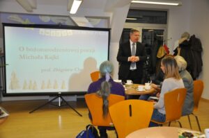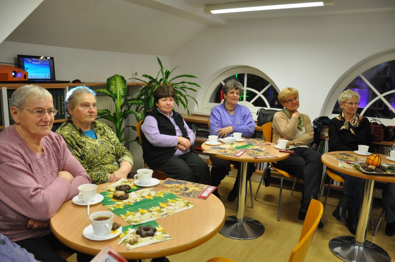 Aby nieco przybliżyć naszym użytkownikom wiedzę na temat bożonarodzeniowej twórczości Kajki oraz spędzić przedświąteczny czas w miłym gronie, WBP zaprosiła do Pokoju z widokiem specjalistę od poezji Michała Kajki, prof. Zbigniewa Chojnowskiego, który podczas krótkiej prelekcji opowiedział w ciekawy sposób nie tylko o samym poecie, ale przede wszystkim o jego twórczości. Uzbrojeni w tę wiedzę uczestnicy zajęć przeszli do ich drugiej części, której celem było stworzenie bożonarodzeniowych ozdób udekorowanych wersetami autorstwa Kajki. W wykonaniu tego zadania pomogły Anita Romulewicz i Agata Kulbicka, które wprowadziły uczestników warsztatów w techniki ozdabiania przedmiotów metodą shabby chic i decoupage. Kiedy już warsztaty dobiegły końca, wszyscy uczestnicy zostali zaproszeni do atrium, by dopiero co wykonanymi ozdobami przyozdobić choinkę. Do Pokoju z widokiem zawitał także niezapowiedziany, brodaty gość w czerwonej czapce, który przyniósł słodkie podarunki. Takim oto sposobem w Wojewódzkiej Bibliotece Publicznej powstała choinka zdobiona poezją Michała Kajki. Drzewko można było oglądać i „czytać” przez cały okres świąteczny. Jeżeli koś jednak nie zdążył, to zapraszamy do Wypożyczalni, gdzie wiersze Michała Kajki są dostępne przez cały rok. |