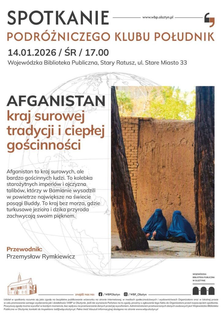 W styczniu 2026 r. zapraszamy na 70. spotkanie PKP Południk – Afganistan – kraj surowej tradycji i ciepłej gościnności. Afganistan to kolebka starożytnych imperiów i ojczyzna talibów, którzy w Bamianie wysadzili w powietrze największe na świecie posągi Buddy. To kraj bez morza, gdzie turkusowe jeziora i dzika przyroda zachwycają swoim pięknem. Na spotkanie z jego historią i teraźniejszością zaprasza Przemysław Rymkiewicz.